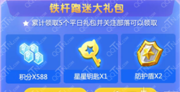 累计领取上述五个礼包以上的玩家关注部落以后还可以领取铁杆跑迷大礼包:积分*588、星星钥匙*1、防护盾*2