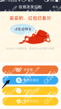 4、当你将现金塞进红包以后,点击发钱包给朋友,当然也可以发微博里让小伙伴们抢红,猜对的小伙伴们就可以获得你的接龙红包啦!