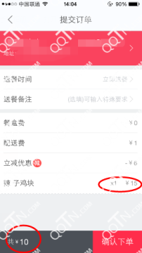 比如,小编点的辣子鸡块,15块钱,满足了百度外卖的满15减6的步骤,所以在提交订单的时候支付支付10元(其中含有配送费1元),检查订单无话的话,就提交订单,在当面进行现金付款即可。