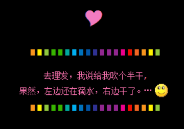 有趣的搞笑留言代码 去理发店给我吹个半干的头发 时间:2015/2/3 10:53:00 作者:qqtn强柔 人气:0 效果如下:或许,你喜欢的口味正好是我讨厌的,或许,你喜欢的人正好是我的讨厌的,可是又有什么关系呢,我喜欢你你喜欢我就好了呀!加载全部内容