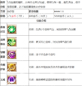 5技能普陀辅助,没有什么特别技能,使用效果一般,虽然便宜,但不推荐招募,还不如招募周免治疗伙伴。