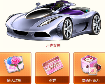 注:使用1个【温情巧克力】打开1支【情人玫瑰】,有机会获得极品A车【月光女神】。