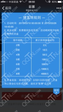 2、这个是活动规则,大家随意猜蓝色球号码即可获得相对应的奖金,提交后,彩票会提示大家参与成功的通知,答案时间会公布在微信号内。