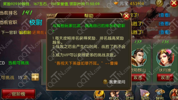 作者:qqtn小影 人气:0全民攻城殿前比武奖励及玩法规则介绍。全民攻城殿前比武一听就是玩家之间的PK,在这里玩家可以自由挑战排名靠前的玩家,通过跟其他玩家比武来提高自己的排名跟官职,而且这个玩法奖励还是很丰富的哦。