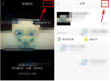 2、跳转至图片编辑页面,给图片添加自己喜欢的贴纸滤镜等,点击【下一步】至添加标记,轻触一下图即可圈出好友、吐槽、添加声音的标签,输入你想说的内容后继续点击【下一步】,给图片添加文字描述后,点击【发布】即可,还可同步到微博上哦。(如下图)