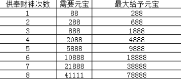 【活动内容】:财神来了,大吉大利!只要给财神供奉,就可能获得多倍金币哦,赶快抓住机会!每次供奉的金币需求与最高获得数量: