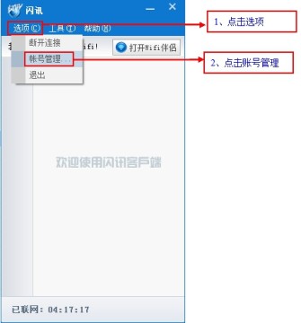 账号管理是对目前电脑所使用的闪讯账号进行管理,可添加新账号,可删除账号等,操作方法是点击选项--账号管理,如下图示: