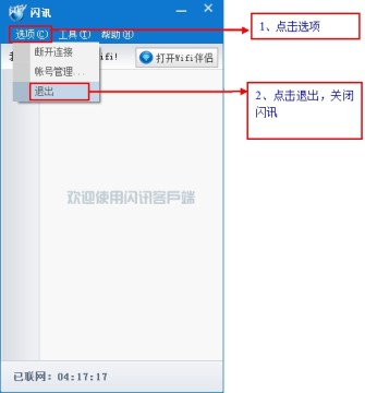 退出即断开网络连接,并关闭闪讯拨号客户端,操作方法为:点击“选项--退出”,如下图: