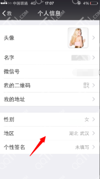 3、然后是该省区的【城市】,点击好后跳转回个人信息页面,就可以在地区一项看到刚才选择的城市啦。(如下图)