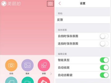 2、在美丽拍首页右上角有设置功能,这里有各种设置,小编觉得比较重要是设置“是否要智能美型”、“是否要自动祛斑”、“是否要自动去眼袋”,非常人性化;