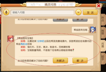 4、帮战活动中结束后胜利的帮派成员可以在场景内拾取宝箱奖励,宝箱有一定的个数限制,手快有,手慢无,其中宝箱中有兽决,金66等等各种道具。