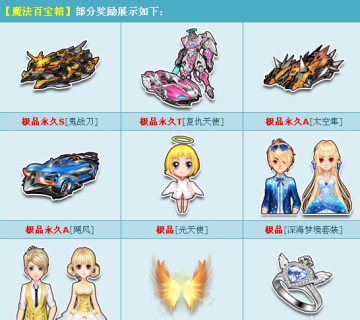QQ飞车魔法百宝箱多少钱?QQ飞车魔法百宝箱开启有什么奖励?魔法百宝箱给力更新,打开魔法百宝箱就会获得神奇咒语的祝福,有机会获得永久S车鬼战刀、永久T车复仇天使、永久A车太空隼、永久A车飓风、极品宠光天使或其他奖励之一!5月15日起正式更新,不要错过哦!