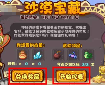 1、前往迷之沙漠,与场景中的挖宝工人进行对话,点击“开始挖掘”按钮,就可以进行挖掘工作了哦!记住哦!每次时间只有30s!
