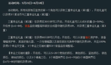 活动期间,所有玩家每日登录的第一个角色可以获取三重幸运礼盒(第1重),开启礼盒可以获得3个复活币与三重幸运礼盒(第2重);三重幸运礼盒(第2重)在获得后30分钟可以开启,开启礼盒可以从成长胶囊 (5~50%)、 升级券 (Lv1~84)、 装备品级调整箱和装扮合成器中随机获得1种, 并获得三重幸运礼盒(第3重);三重幸运礼盒(第3重)在获得60分钟可以开启,开启后, 可以从装备强化保护券、 装备增幅保护券、 凯丽的强化器、 一次性增幅器以及高级装扮兑换券中随机获得1种, 并且100%获得1个幸运天空蛋、 1个幸运之石袖珍罐和3个装备品级调整箱。