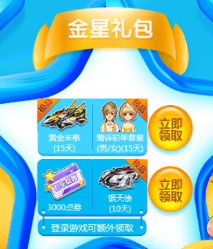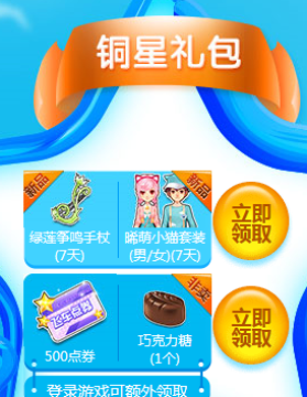 1、玩家根据测试得知自己所属的幸运星领取对应的礼包,登录游戏后更可额外领取更多的奖励;