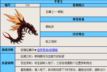 造梦西游4平等王在哪里?造梦西游4平等王掉落什么装备?平等王在螺旋地狱中的蚣之地狱,打败平等王有几率掉落蜈蚣皮,小勇士们想要蜈蚣皮的话快来挑战吧!