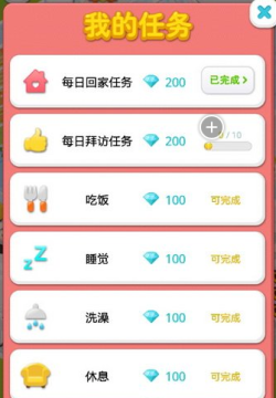 2、然后开始做任务,每个任务完成以后有100钻石。先不算拜访任务。吃饭睡觉洗澡休息,每五个小时任务刷新一次,每天三次任务不难,100*4*2=800。首次任务后,就是每次完成10钻石了。10*4*2*2=160。一天就有960钻石。