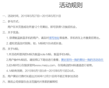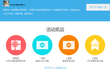 在活动页面开通12个月黄钻即可获得一次抽奖机会,奖品有魅蓝新品手机、魅蓝手机M码、100点黄钻成长值,100%中奖。小编估计中奖几率大部分都是成长值,如果你缺成长值的话,可以续费开通黄钻。