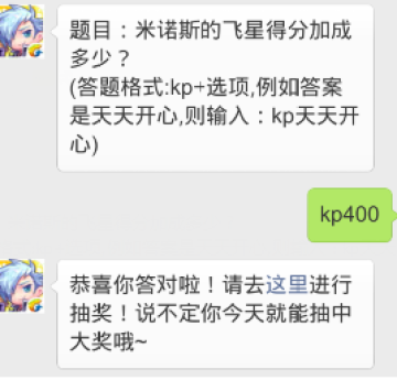 米诺斯的飞星得分加成400%,所有天天酷跑6月4日每日一题的答案就是kp400,小伙伴都回答对了吗?希望所以的玩家都能领取天天酷跑6月4日每日一题的奖励