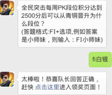 全民突击每周PK段位积分达到2500分后可以从青铜晋升为什么段位?