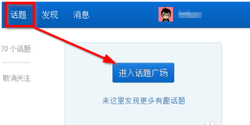2、点击话题,进入话题广场,你可以看到自己以前关注的话题。右上角有一个话题广场,点击进入。