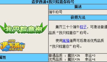 造梦西游4集齐三十个端午粽子,即可激活普通品质的“我只粽意你”称号。使用离骚道具即可激活优秀品质的“我只粽意你”称号。