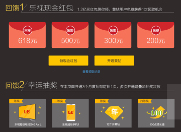 黄钻回馈第三期,黄钻用户可以免费领取乐视现金红包,连续开通三个月黄钻即可参与抽奖,奖品为成长值、年费黄钻、乐视电视、乐视手机。