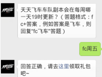 天天飞车车队副本会在每周哪一天19时更新?(答题格式:fc+答案,例如答案是飞车,则回复“fc飞车”答题)