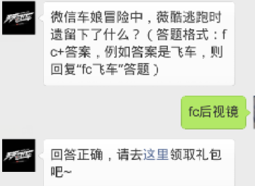 问题:微信车娘冒险中,薇酷逃跑时遗留下了什么?(答题格式:fc+答案,例如答案是飞车,则回复“fc飞车”答题)