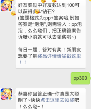 题目:好友奖励中好友数达到100可以获得多少钻石(答题格式为:pp+答案哦,例如答案是”泡泡”,则输入:pp泡泡,么么哒们,把正确答案告诉糖小萌就可以去领奖哟~)
