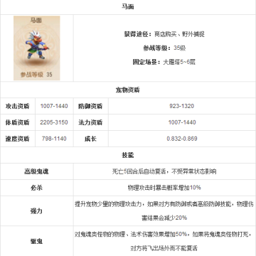 作者:qqtn小影 人气:0梦幻西游手游红尘试炼-锦毛貂精送的马面怎么样?技能属性如何?马面是梦幻西游的鬼怪型宠物,对对付鬼怪性宠物可以有攻击加成的哦。接下来,一起来看看梦幻西游手游马面宠物属性图鉴吧!