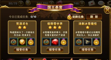 国王悬赏的任务难度分成5个等级,以星星的数量表示。星星数量越多,难度越大,奖励也就越好。每次会有3个任务同时发布,如果没有星级高的奖励,玩家可以通过刷新任务来更换,不过每次需要20钻石。
