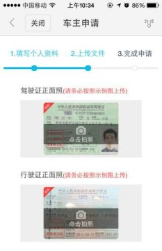 第三步:填写相关的车主信息,把驾驶证与行驶证的照片上传,如果这两个证没带在身上也不着急,可以事后补上。上传完后点击提交。