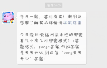今日是7月13日。天天爱消除每日一题: 爱福利菜单栏的绑定有礼中有几种绑定模式?(回答方式:peng+答案,例如答案如果是天天爱消除。则回复peng天天爱消除,这样就算是正确答案。)