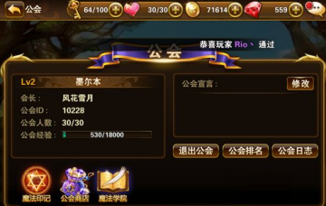 魔法印记:所谓的魔法印记就是每天的签到系统,通过花费金币或者钻石帮助公会获得活跃和经验,自己也可以获得贡献!花费越多,公会成长越快!