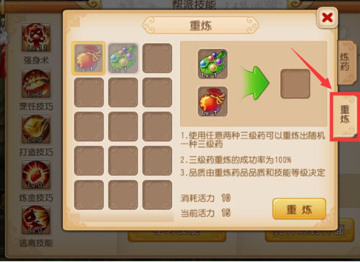 重炼说明:“花费10点活力将两个三级药重炼为一个三级药。重炼成功率100%,得到的三级药种类随机。