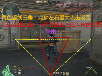 上面两张图片为龙鳞和干将莫邪同一位置下重击攻击范围,从三角行虚实线内可以看出重击时的两把近身武器攻击范围是相同的。