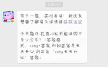 今日是7月17日。天天爱消除每日一题:花费20钻石能够购买多少金币?(回答方式:peng+答案,例如答案如果是天天爱消除。则回复peng天天爱消除,这样就算是正确答案。)