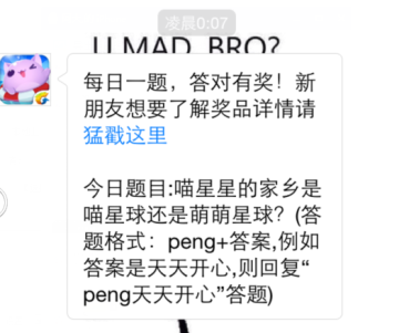 今日是7月25日。天天爱消除每日一题:喵星星的家乡是喵星球还是萌萌星球?(回答方式:peng+答案,例如答案如果是天天爱消除。则回复peng天天爱消除,这样就算是正确答案。)