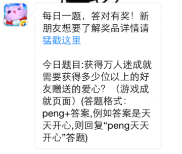 天天爱消除7.26日每日一题:获得万人迷成就需要获得多少位以上的好友赠送的爱心?(游戏当中的回答方式为peng+答案,在这里需要注意peng为小写哟,小编给大家举个例子,比如答案是喵星球,那么正确答案应该是peng喵星球)!