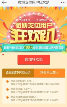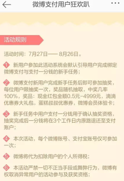 作者:qqtn强柔 人气:0新浪微博支付用户狂欢趴!新用户绑定支付宝支付0.1元即可100%领微博红包,老用户也可参与,但是领取的奖品就不是现金啦!感兴趣的小伙伴们赶紧来参与吧!