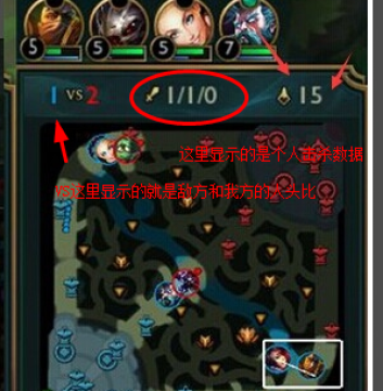 其实这个在看补兵的时候就可以发现,补兵左方显示的个人击杀数据,再左边就是显示敌方和我方的人头比。红色自然是敌人,绿色数字显示的就是我方。