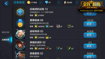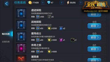 《全民超神》任务系统是玩家获取各类收益的最佳选择,虽然说主线任务达成条件比较苛刻,但无需着急,慢慢做即可。每日任务能给玩家提供海量角色成长经验值,并且达成条件也十分简单,因此强烈推荐玩家每日必做。