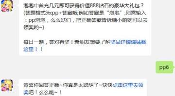 作者:qqtn小影 人气:0全民泡泡大战中首充几元即可获得价值888钻石的豪华大礼包?8月9日的微信每日一题活动已经更新完毕了,那么全民泡泡大战中首充几元即可获得价值888钻石的豪华大礼包?下面一起来看看全民泡泡大战8月9日每日一题的答案吧。
