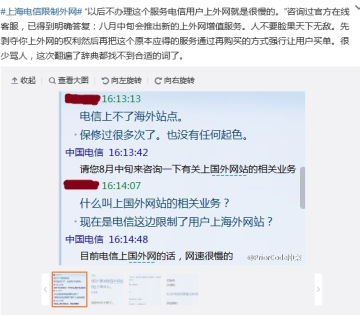作者:qqtn强柔 人气:0众所周知,中国电信的标语是“世界触手可及”,然而现在,这样的话却成了一种讽刺。近日微博用户爆料,上海电信在八月的中旬会推出新的“浏览国外网站”增值服务,这是通过咨询电信官方客服得到的明确答复。对此,网友们质疑电信这是要走氪金手游路线还是付费DLC路线?