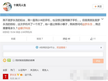 有网友发出了一条微博,表示:“我不是罗永浩的粉丝,我一直用小米的手机,也没想过要用锤子手机,但是男朋友是罗永浩的铁粉,这次手机坏了一个月了,他一直让我等小锤子,我就想问问@罗永浩 ,我还需要等多久?”
