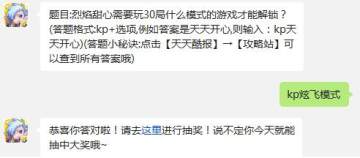 烈焰甜心需要玩30局炫飞模式模式的游戏才能解锁喔,所以8月12日的天天酷跑每日一题答案就是kp炫飞模式,最后希望所有的小伙伴都能领取每日一题的奖励。