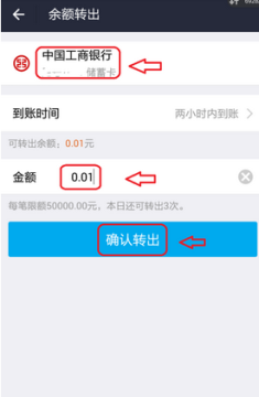 4、选择转出到的银行卡,转出金额,点击确认转出,如下图所示