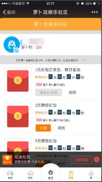 微信关注“萝卜玩”举报的APP下载送红包的活动,首次登陆的可以获得200萝卜籽就可以直接对话1元的微信红包了,同时每日在萝卜玩“互动专区”游戏中任意玩满5局 ,即可获得一次抽红包机会,每日11点、18点整分别开启抽红包,每次数千份红包,抽完为止。网友快去参加试试运气吧!