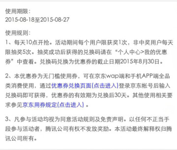 1、每天10点开抢。活动期间每个用户限获奖1次,非中奖用户每天限抽奖5次。抽奖成功后获得的兑换码请在“个人中心>我的优惠券”中查看。兑换码兑换为优惠券的截止日期2015年8月30日。